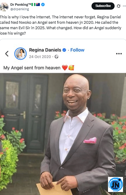 In his caption, @drpenking wrote: “This is why I love the internet. The internet never forgets. Regina Daniels called Ned Nwoko an angel sent from heaven in 2020. What changed? How did an angel suddenly lose his wings?” The caption instantly caught the attention of users across multiple platforms, prompting discussions about the dynamics of fame, love, and the public scrutiny of celebrity relationships.