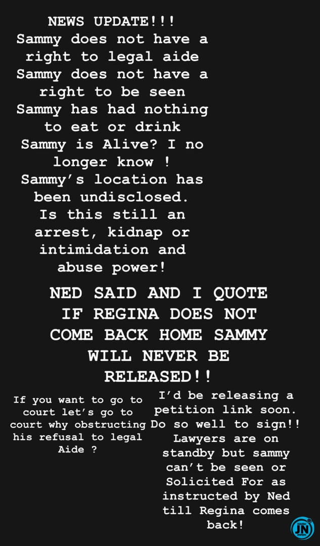 “Sammy has had nothing to eat or drink since he was arrested. Nobody is allowed to see him. Ned said if Regina doesn’t come back home, Sammy will not be released. If anything happens to Sammy, hold Ned Nwoko responsible. You can’t do this in a civilized country.”
