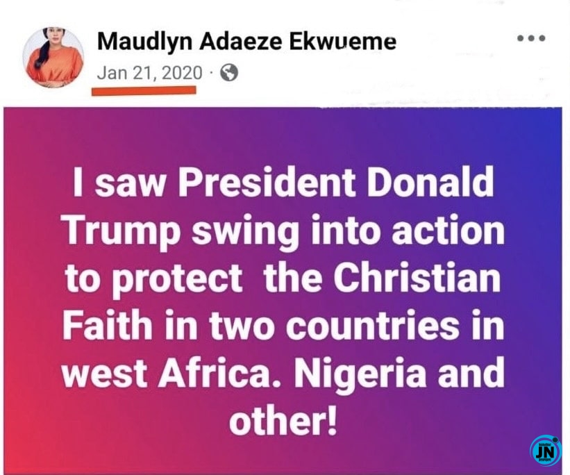 The 2020 prophecy, posted five years ago, resurfaced across multiple social media platforms, including Facebook, X (formerly Twitter), and Instagram. In her original post, Ekwueme described a vision in which President Trump would take action to safeguard Christians in West Africa, stating, “I saw President Donald Trump swing into action to protect the Christian Faith in two countries in West Africa. Nigeria and other!”