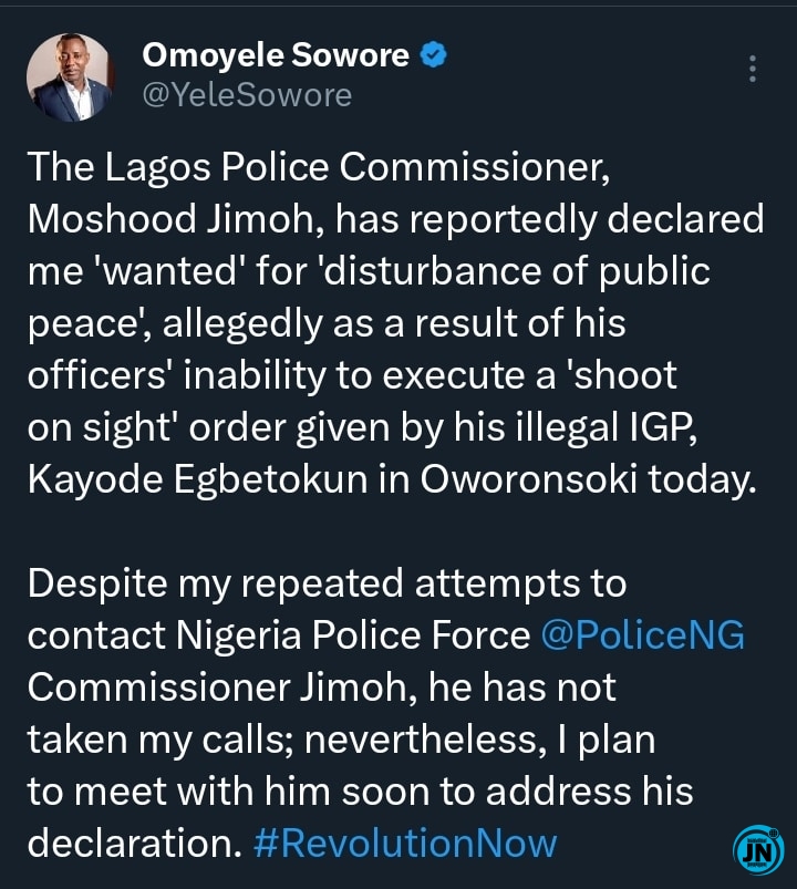 He wrote: “The Lagos Police Commissioner, Moshood Jimoh, has reportedly declared me ‘wanted’ for ‘disturbance of public peace’, allegedly because his officers failed to carry out a ‘shoot on sight’ order from his illegal IGP, Kayode Egbetokun, in Oworonsoki today.”