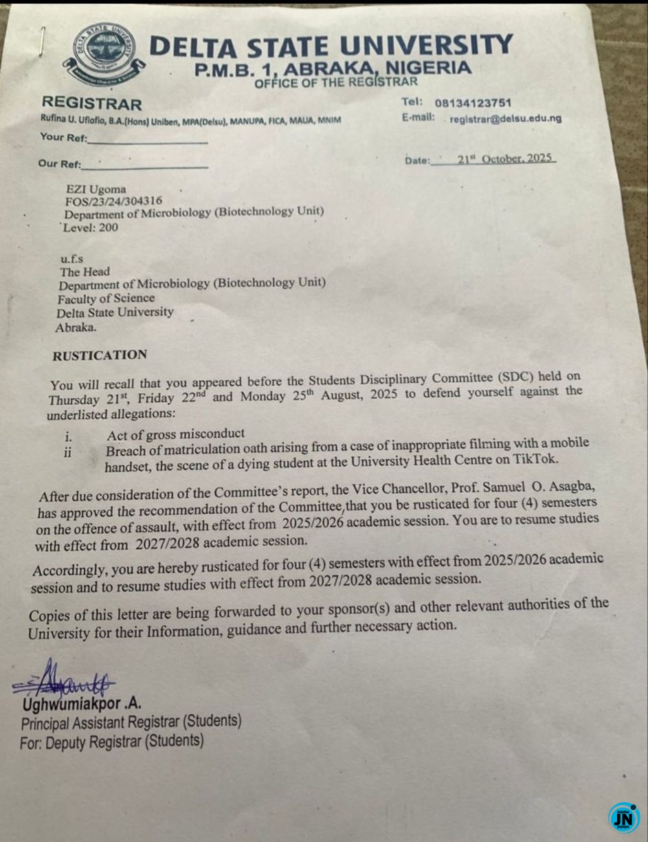 A 200-level Biotechnology student of Delta State University (DELSU) has been rusticated for two academic years after publicly posting a disturbing video of a dying colleague online, according to an official university statement now circulating on social media.