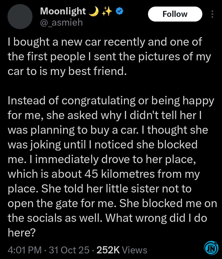 However, instead of celebrating with her, the friend questioned why she hadn’t informed her earlier about her plans to buy a car. The lady initially thought it was sarcasm or a playful comment—until she realised she had been blocked. Shocked and hurt, she immediately decided to resolve the issue in person.